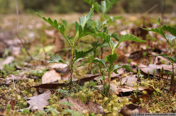 celery-top pine (phyllocladus aspleniifolius) seedlings show typical coniferous needle cotyledons before switching over to phylloclades.